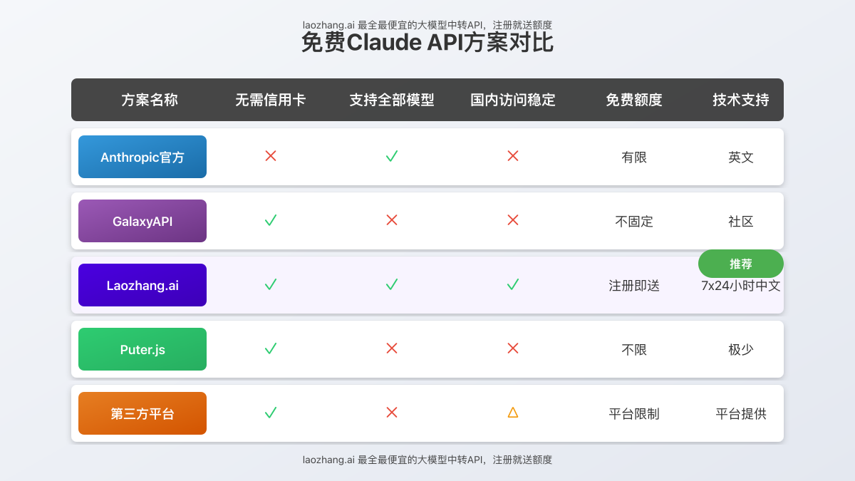 为什么推荐Laozhang.ai:作为专为中国用户设计的服务,Laozhang.ai解决了跨境访问问题,提供稳定快速的API调用体验,同时价格合理,注册即送免费额度,是目前最适合中国开发者的Claude API解决方案。